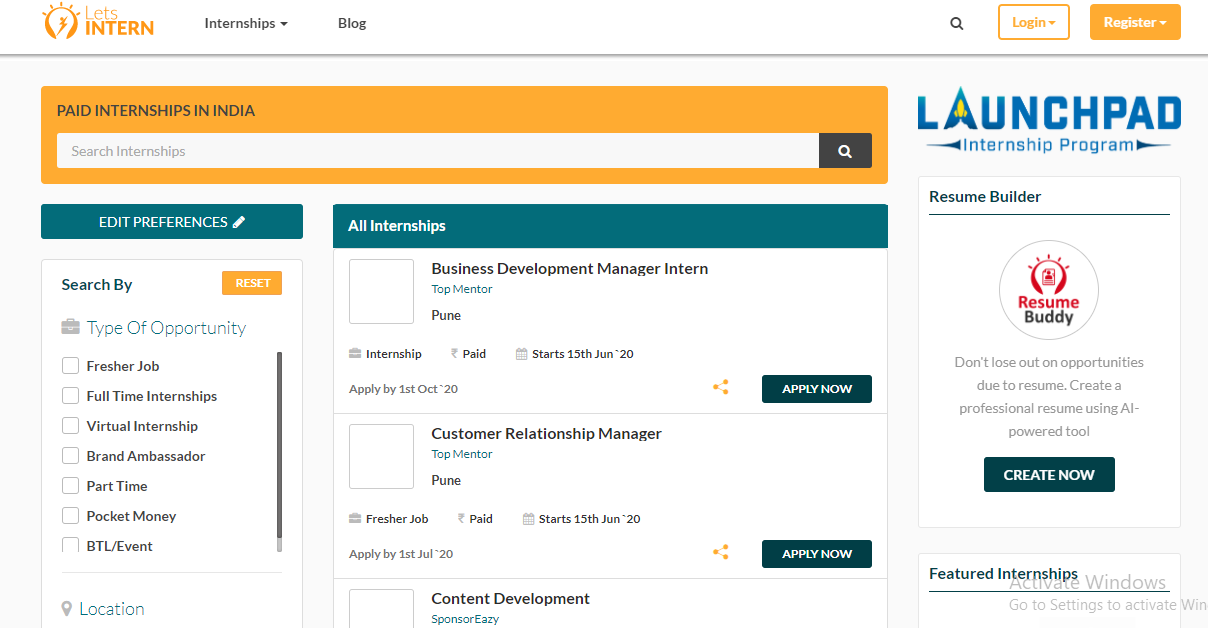 Letsintern.com India का Best Internship Website है। इस Website पर आपलोग को बहुत सारा Internship का Opportunity मिलता है। यह Website पर Everyday 100+ से ज्यादा इंटर्नशिप का Post आता है। इस वेबसाइट पर आपलोग Category Wise Internship Search कर सकते है यहाँ पर बहुत सारा Category है जैसे की Location Wise , Degree Wise और Position Wise etc. यहाँ पर आपलोग को Paid इंटर्नशिप ज्यादा मिलता है जो की एक फ्रेशर के लिए बहुत ज्यादा ख़ुशी की बात है। इस वेबसाइट पर Everyday 5000+ से ज्यादा Students इंटेरंसीप के लिए अप्लाई करते है और ज्यादा से ज्यादा स्टूडेंट्स को इंटर्नशिप मिल जाती है। अगर आप एक स्टूडेंट है और आपको Internship करना है तोह आपको जरूर इस Website पर Visit करना चाइये।