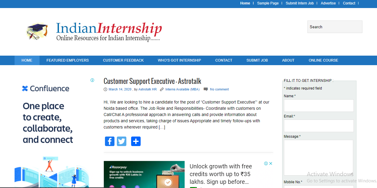 Twenty19.com India का Best Internship Website है। इस Website पर आपलोग को बहुत सारा Internship का Opportunity मिलता है। यह Website पर Everyday 100+ से ज्यादा इंटर्नशिप का Post आता है। इस वेबसाइट पर आपलोग Category Wise Internship Search कर सकते है यहाँ पर बहुत सारा Category है जैसे की Location Wise , Degree Wise और Position Wise etc. यहाँ पर आपलोग को Paid इंटर्नशिप ज्यादा मिलता है जो की एक फ्रेशर के लिए बहुत ज्यादा ख़ुशी की बात है। इस वेबसाइट पर Everyday 5000+ से ज्यादा Students इंटेरंसीप के लिए अप्लाई करते है और ज्यादा से ज्यादा स्टूडेंट्स को इंटर्नशिप मिल जाती है। अगर आप एक स्टूडेंट है और आपको Internship करना है तोह आपको जरूर इस Website पर Visit करना चाइये।